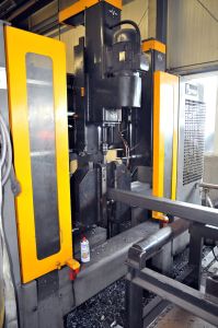 Eine computergesteuerte Säge/Bohr-Straße für Stahl ermöglicht mehrere Bearbeitungsschritte der Quadratrohrstützen in einem Arbeitsgang.